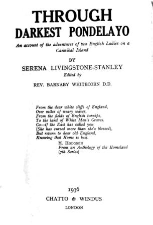 In 1936 the normally staid London publisher, Chatto & Windus, published a stirring account of two women travellers’ adventures in a distant outpost of empire. Entitled Through Darkest Pondelayo, and written by the appropriately christened adventuress Serena Livingstone-Stanley, it was presented in the form of letters back home, edited by one Rev. Barnaby Whitecorn D.D., the author’s ‘next door neighbour’.